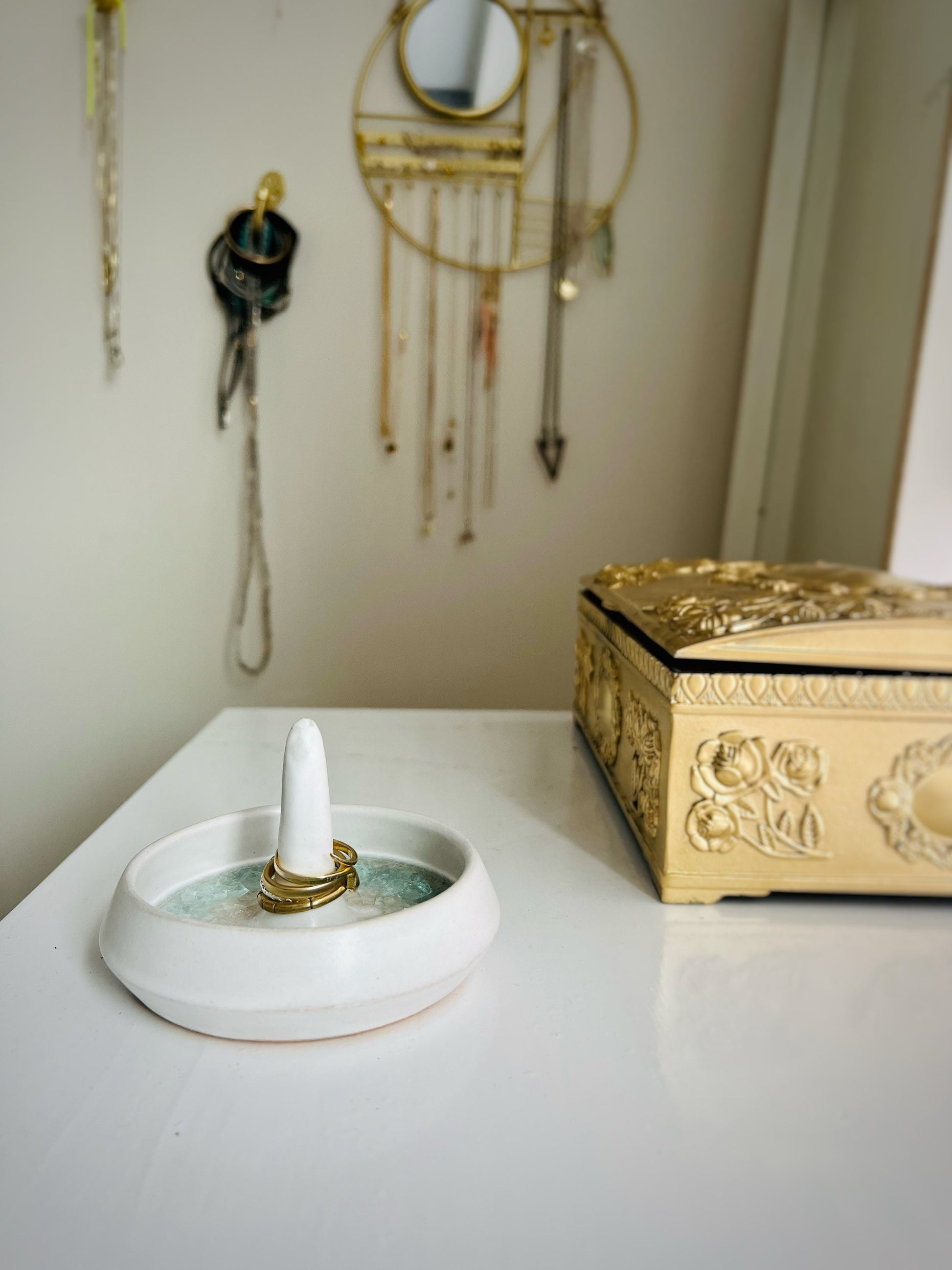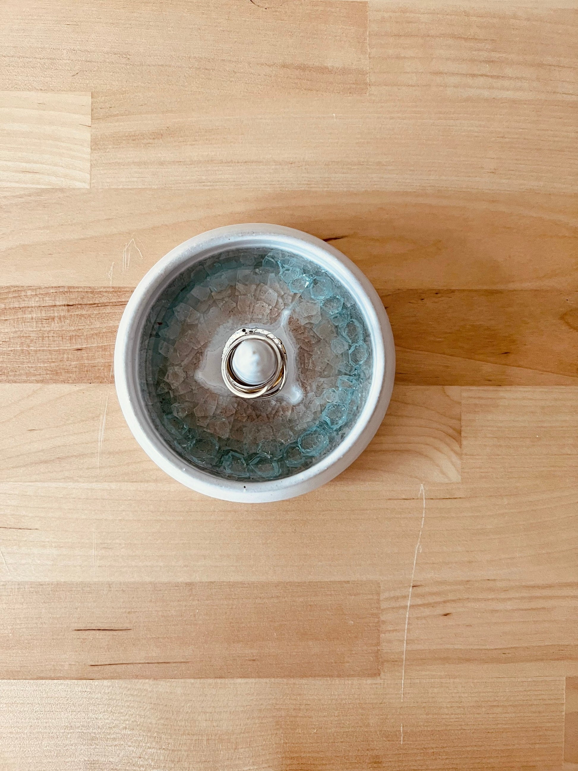 Angled Jewelry and ring dish. Ceramic. White and glass. Handmade