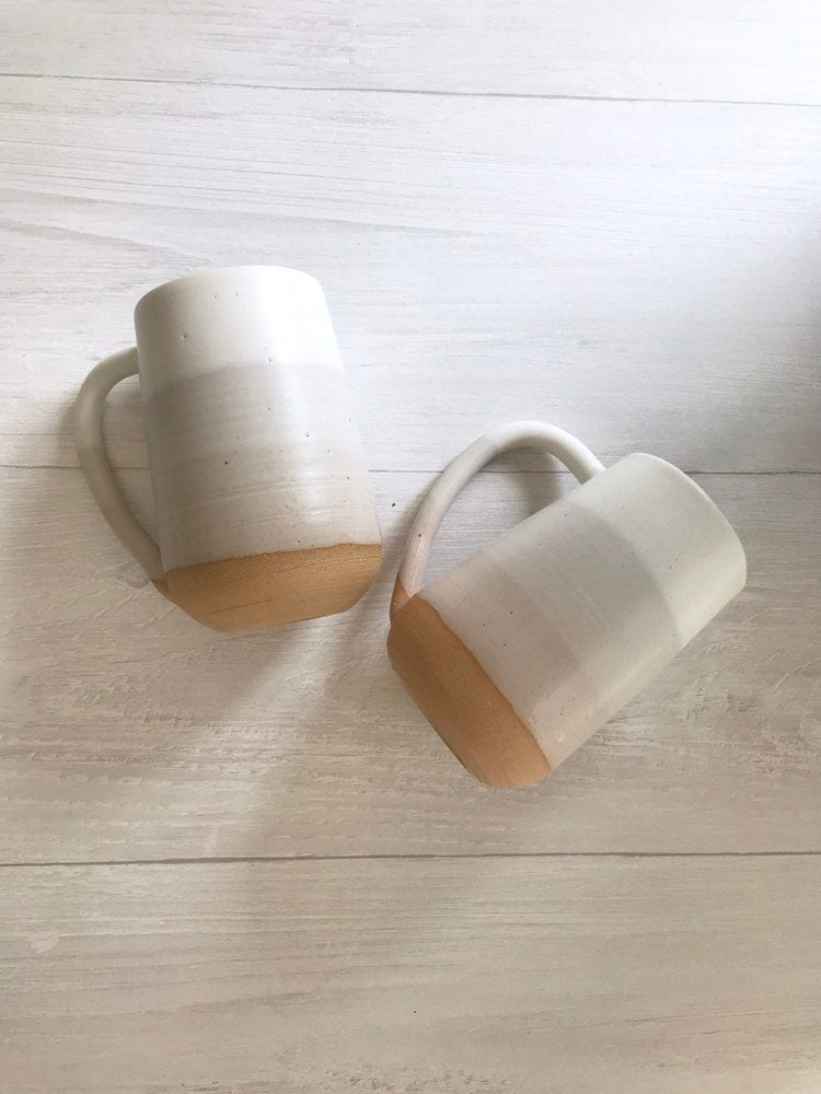These modern ceramic mugs were thrown on the potters wheel attached with a handle then dipped in a warm white glaze. Each mug is unique.