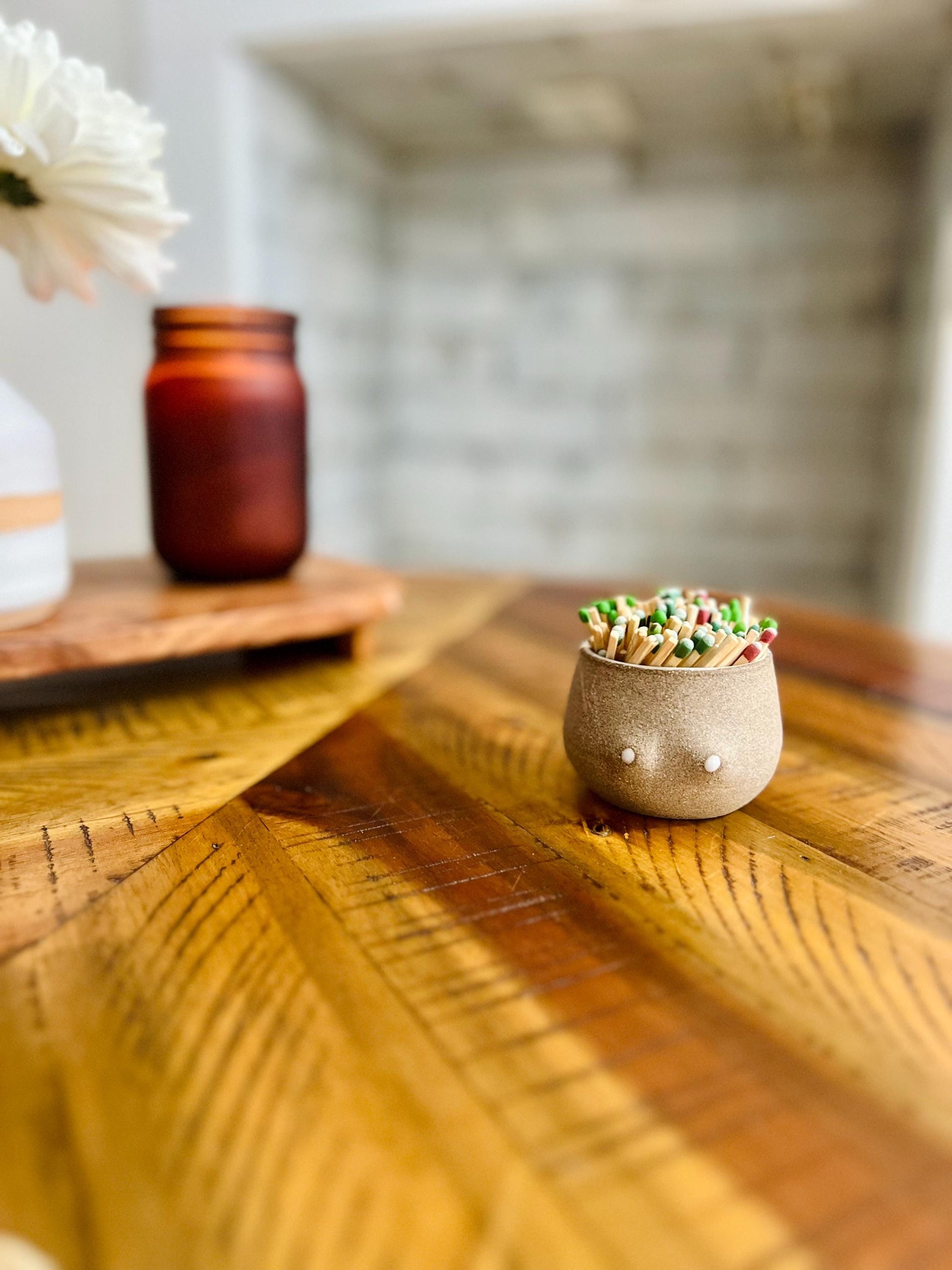 These adorable, offbeat match striker jars were thrown on the potter‘s wheel using beige stoneware and glazed inside with a smooth black finish. Strike anywhere on the un-glazed side of the jar and the match will light! These multi-purpose pots are also great for small plants, such as mini orchids and succulents, and make for excellent candle holders!