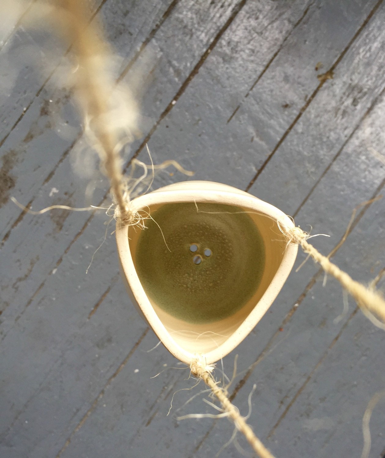 Before being half dipped in a bright baby blue they were hand paddled into a soft triangle shape. Holes were added on top for easy hanging and twine included.