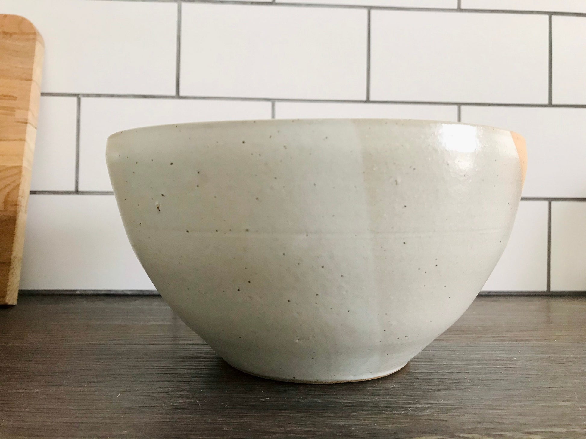 these lightly speckled bowls were thrown on the potters wheel and glazed in white. These large bowls are perfect for cooking, kitchen prep, popcorn, fruit bowls, presentation bowls and more