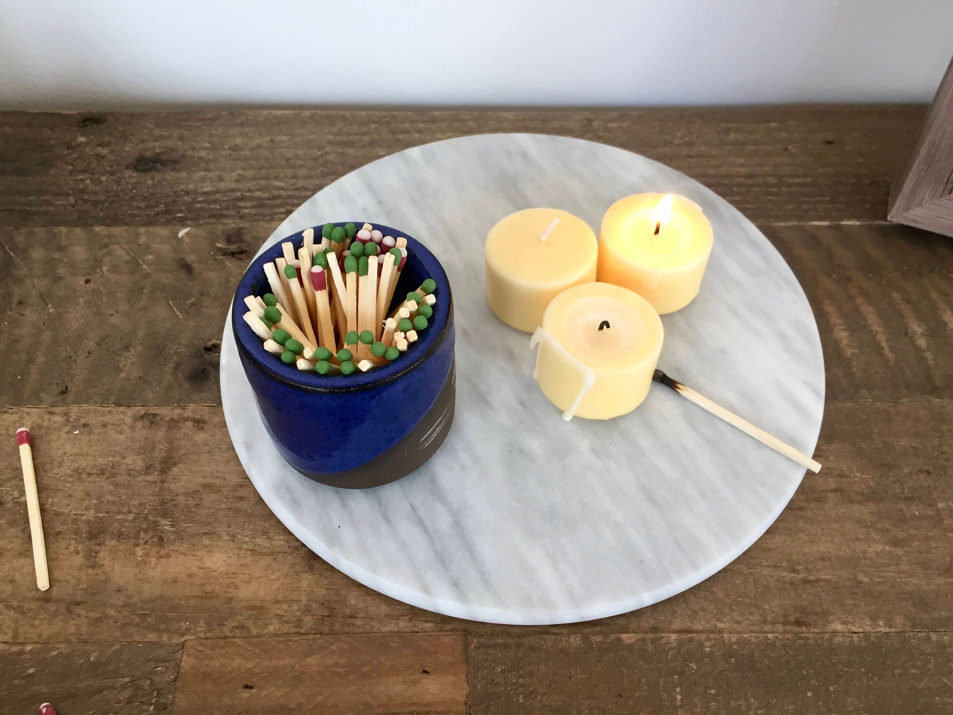 This mini match striker jar was thrown on the potters wheel then glazed in a bright cobalt blue with gray tones. strike anywhere on the un glazed side of the jar and the match will light!
