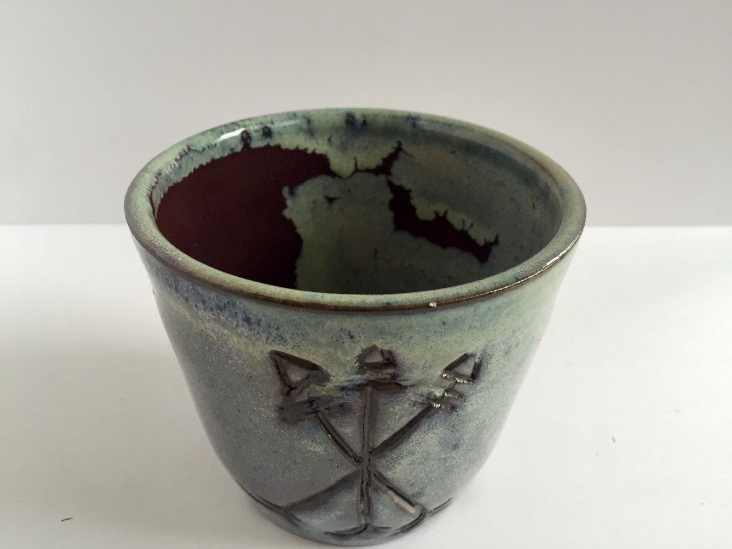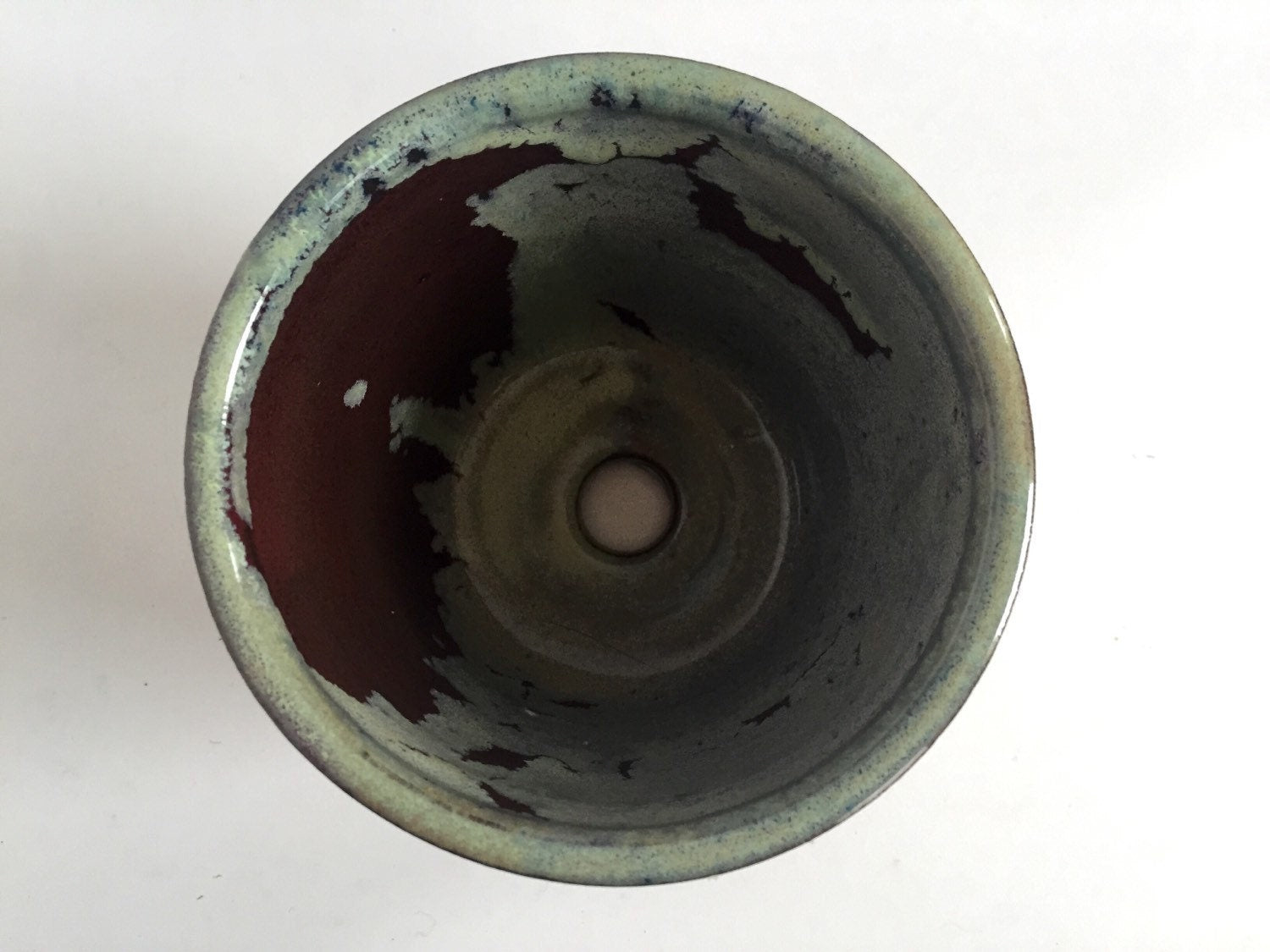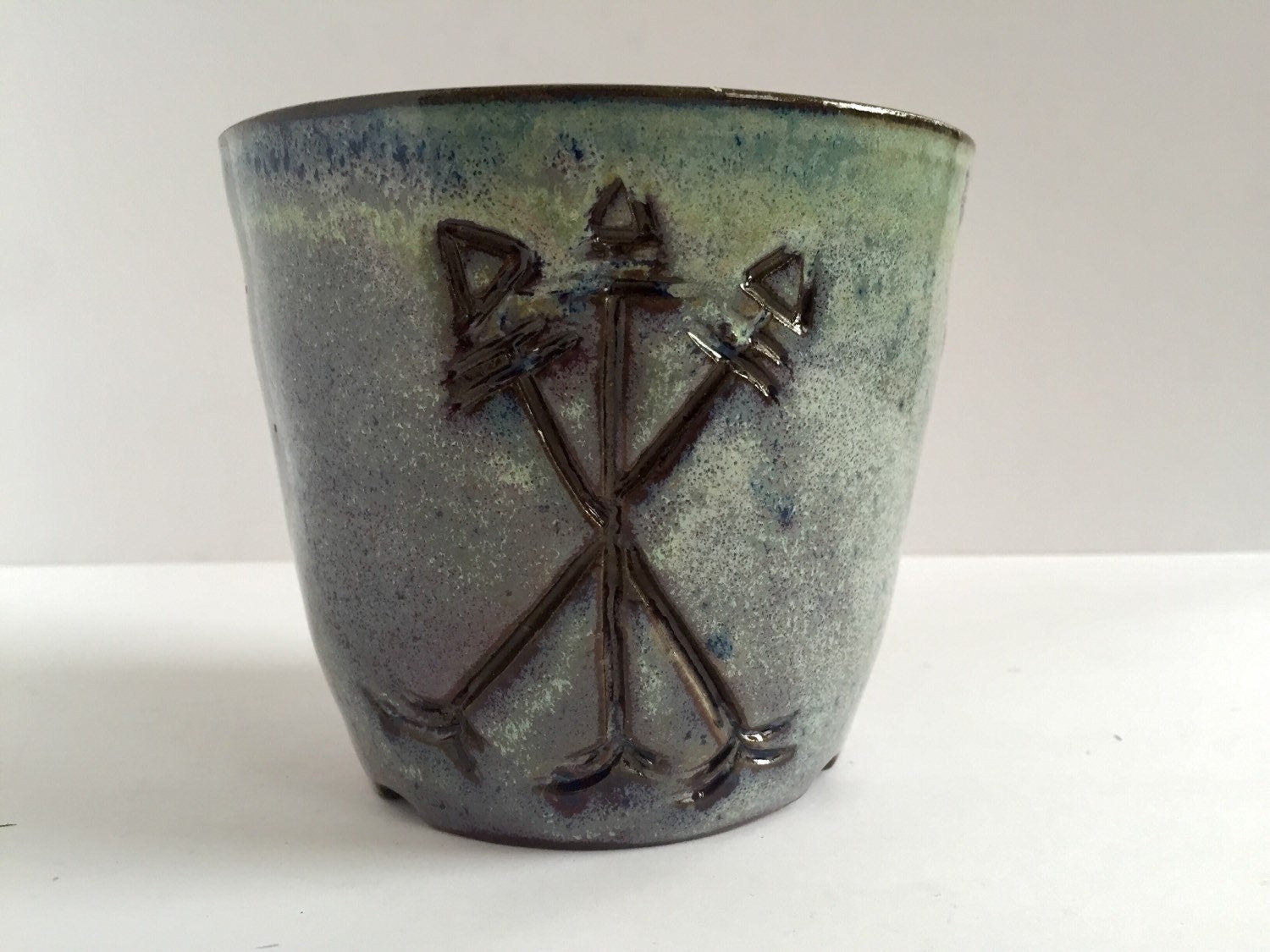 These awesome outdoor planters were thrown on the potters wheel with terra-cotta clay then hand carved with a pattern of arrows done freehand before being glazed in soft blue with purple and red hues. Super unique and one of a kind, there is a hole in the bottom for water to exit through the base.