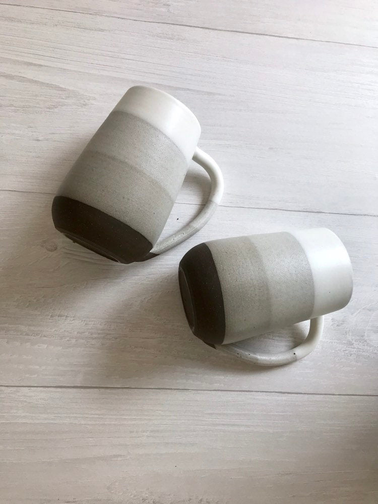 These modern ceramic mugs were thrown on the potters wheel attached with a handle then dipped in a warm white glaze. Each mug is unique.
