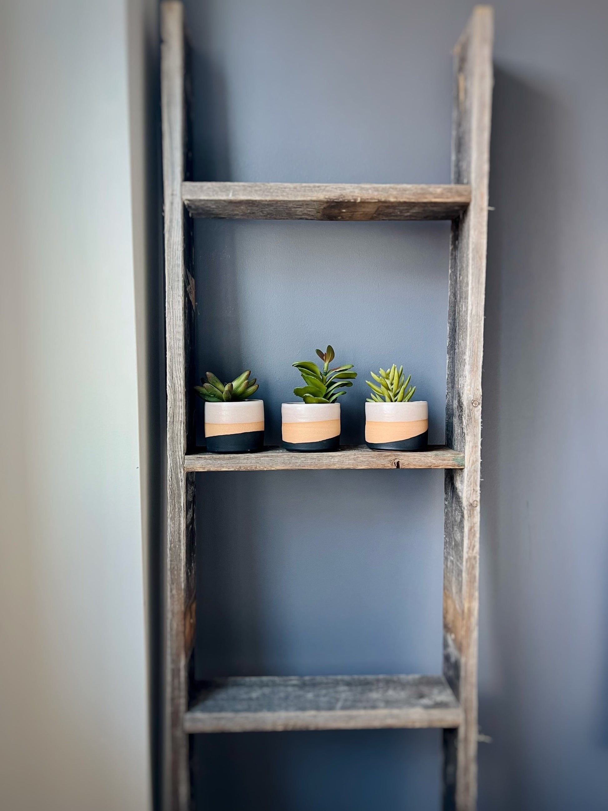 This little trio of succulent planters were thrown in the potters wheel, then glazed on the outside. Unglazed on the inside and each comes with a drainage hole. Perfect fit for 2” succulents. They Come as a set of three!
