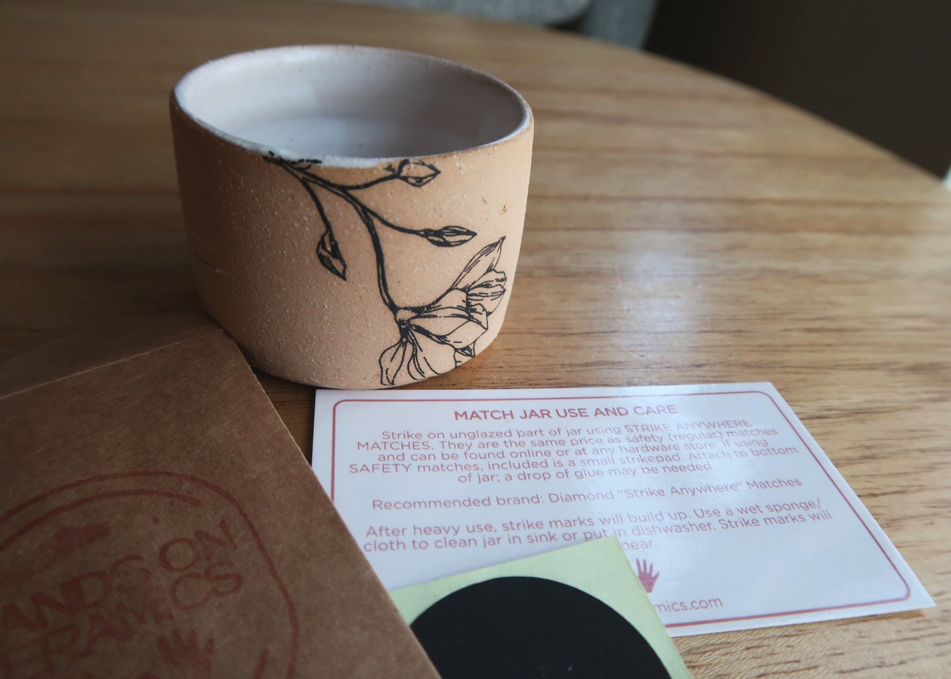 These natural, minimalist match striker jars were thrown on the potter‘s wheel using beige stoneware and feature a warm white glaze interior and a beautiful distressed flower design on the exterior. Strike anywhere on the un-glazed portion of the jar and the match will light! These multi-purpose pots are also great for small plants, such as mini orchids and succulents, and make for excellent candle holders!