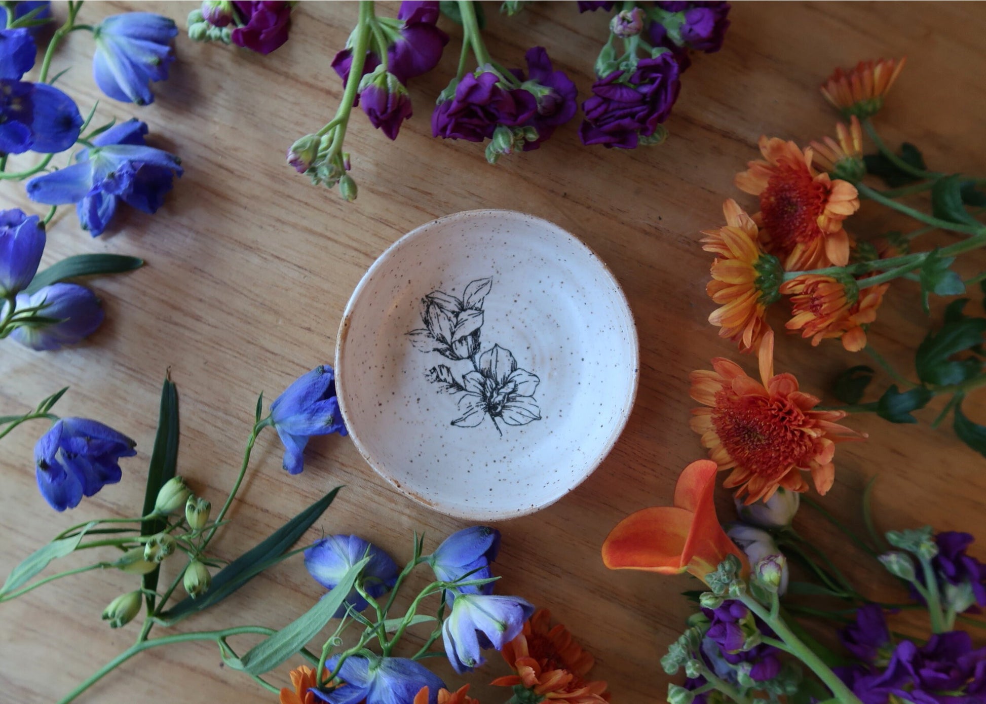 These charming ramekins are thrown on the potter‘s wheel using stoneware clay, glazed inside with a warm white, and finished with a floral overglaze decal. The beige, unglazed portion of the bowl is touchable even when bowl is hot.