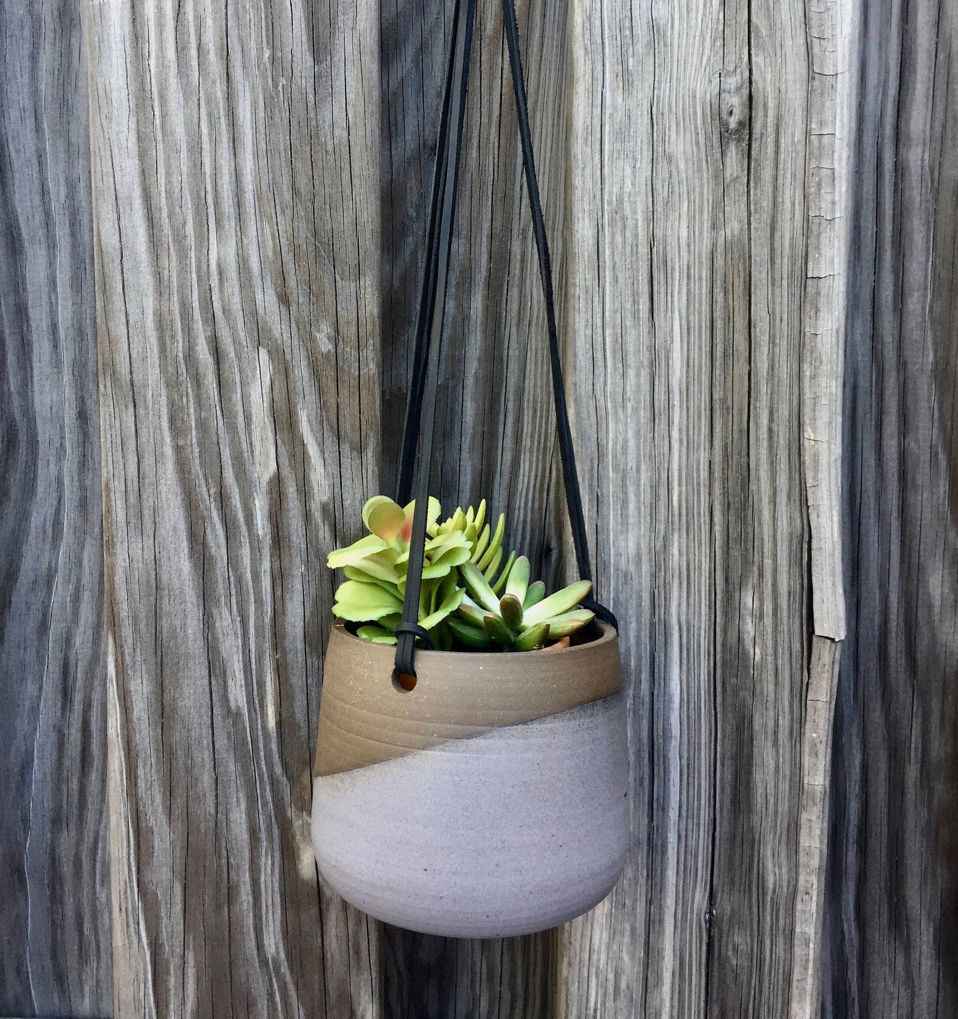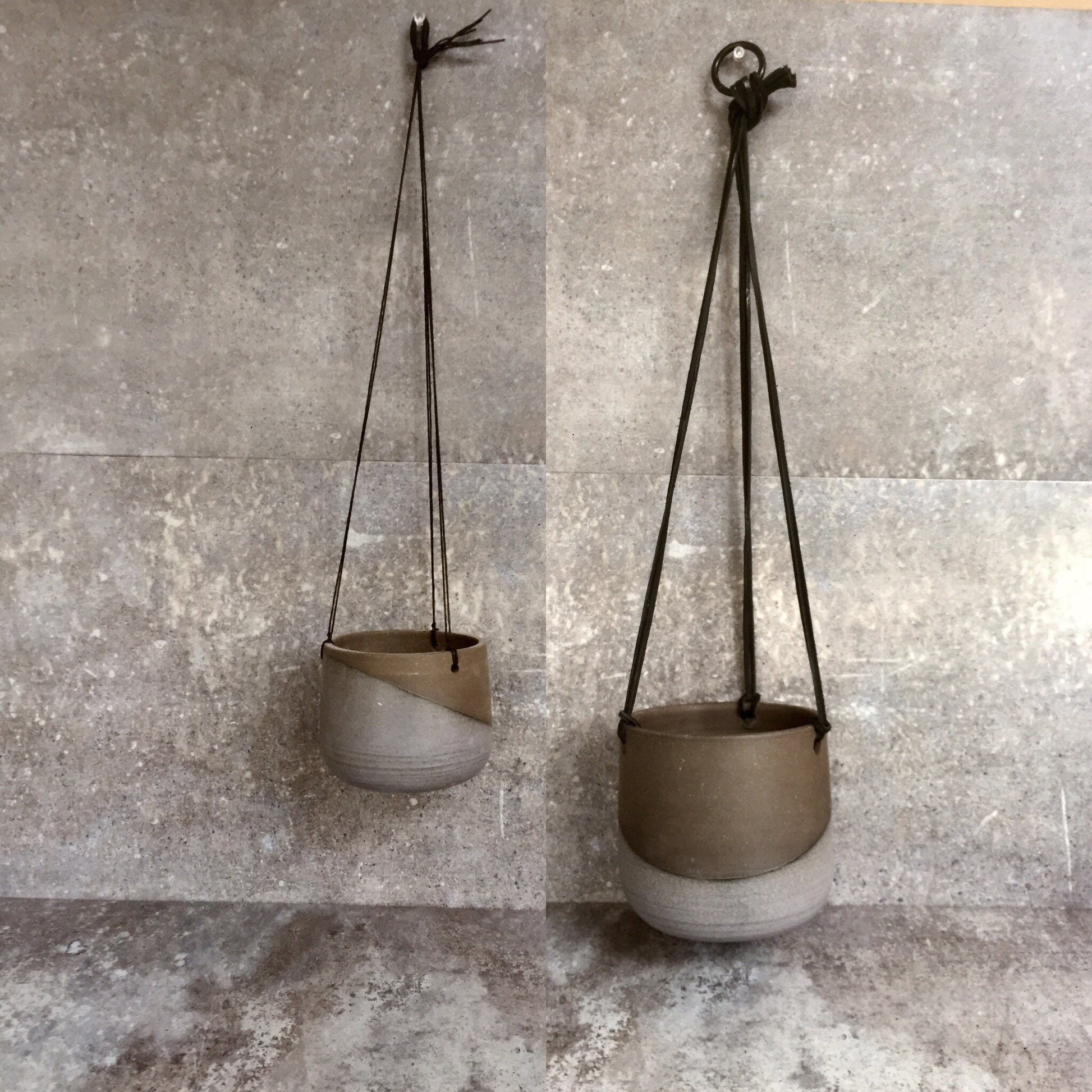 These hanging flower pots were thrown on the potters wheel then flipped over and trimmed into a round orb. glazed on the outside with a matte purple/gray Unglazed on the inside.