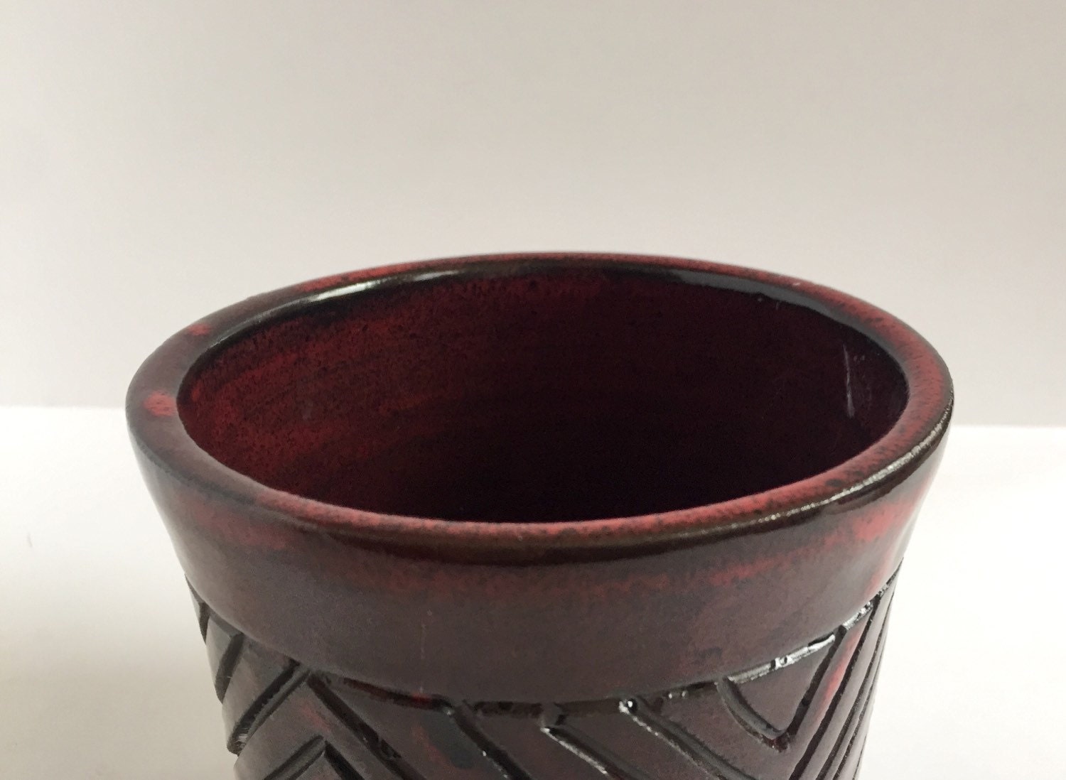 These awesome outdoor planters were thrown on the potters wheel with terra-cotta clay then hand carved with a geometric design done freehand before being glazed in a deep rich Burgundy red. Super unique and one of a kind, there is a hole in the bottom for water to exit through the base.