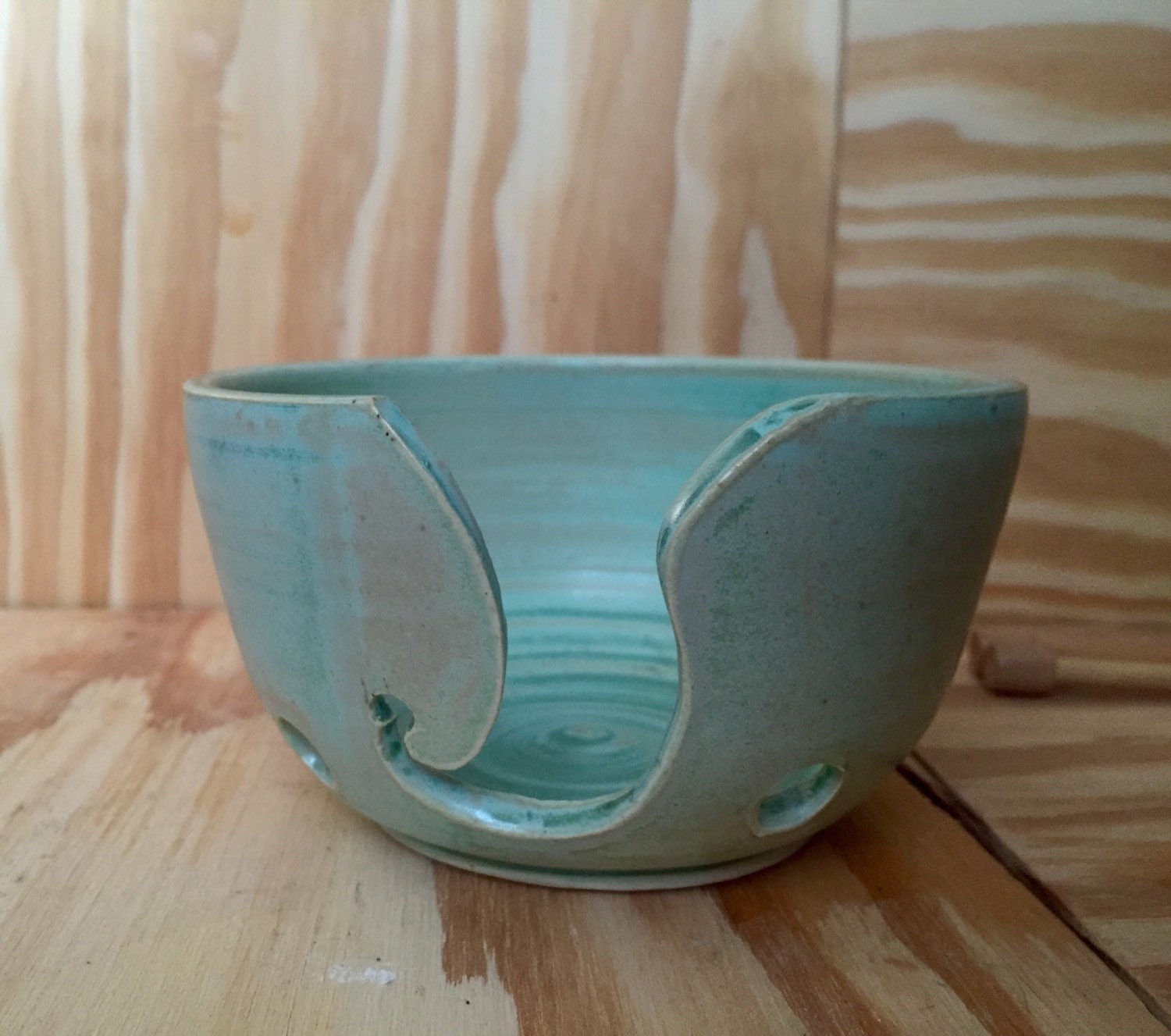 Hand crafted ceramic mint green yarn kitting bowl with hand cut pattern