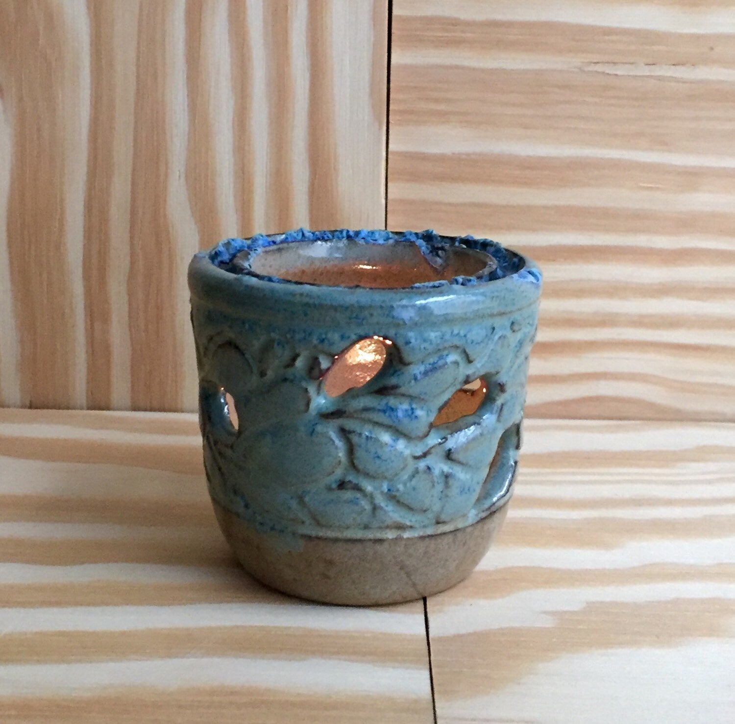 These small candle and tea light holders were thrown on the potters wheel then handcarved free hand style. glazed in a almond and half dipped in a teal/blue before being rimmed with broken clear glass. The melted glass adds a rich rustic effect. These tea light holders are decorative and functional and look great even when not on use!