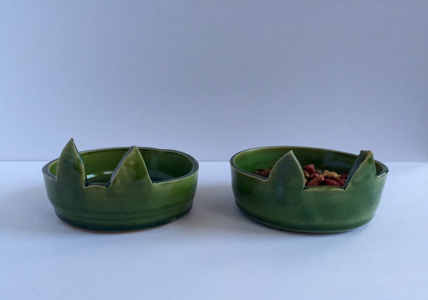 These adorable cat bowls were thrown on the potters wheel then hand cut out to form little cat ears on top. Glazed in a warm apple green.