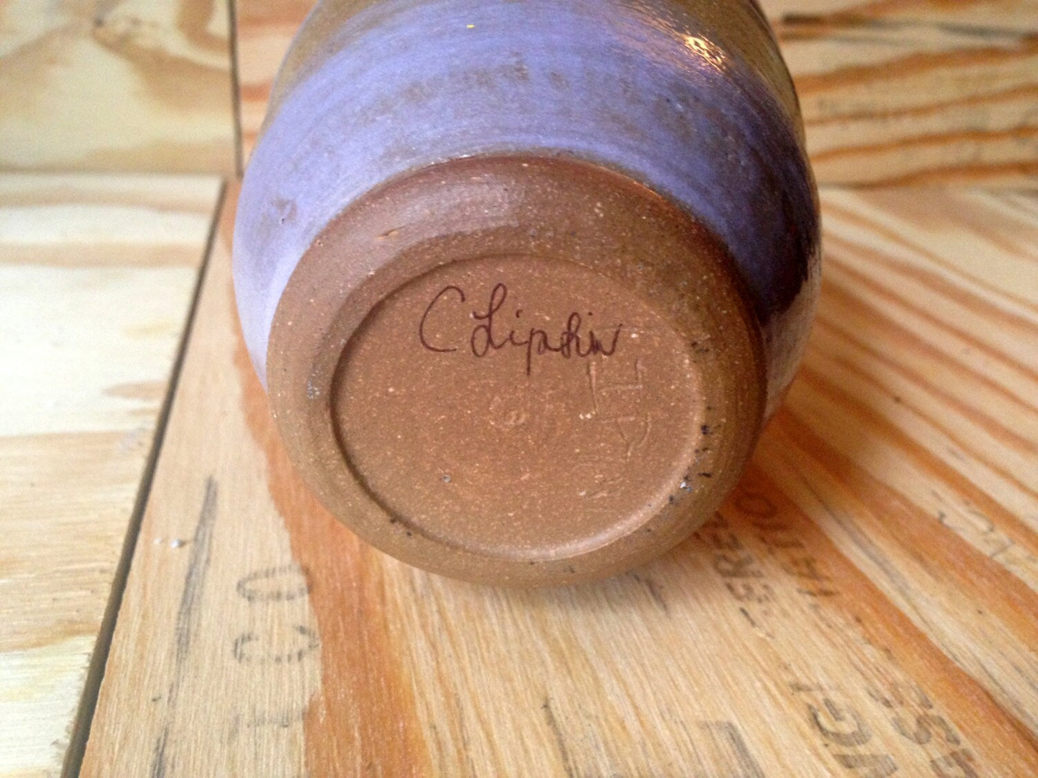 This handle-less mug was hand thrown on the potters wheel. It is rimmed on the outside with pretty lavender engobe (or under-glaze) and glazed again with clear to showcase the natural clay color. The inside and rim has a rich black glaze that gives a nice contrast to the lavender.There is an option to buy just one, or as a pair.