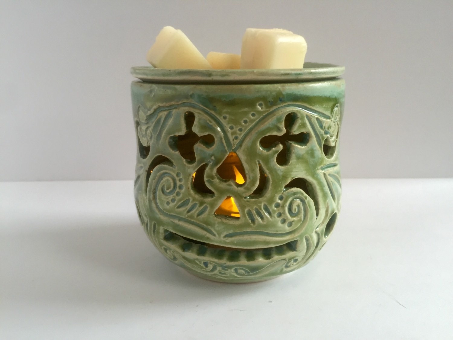 this awesome piece was thrown on the potters wheel in two pieces then carved and cut out with a free hand sugar-skull design before being glazed in a turquoise. This is a great addition to any home because it extremely decorative and functional. just put your favorite smelling wax into the top and a small candle or tea-light in the base and have your home smelling wonderful.