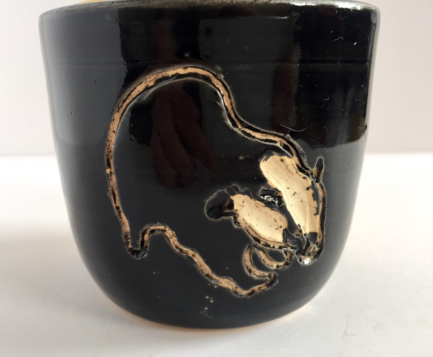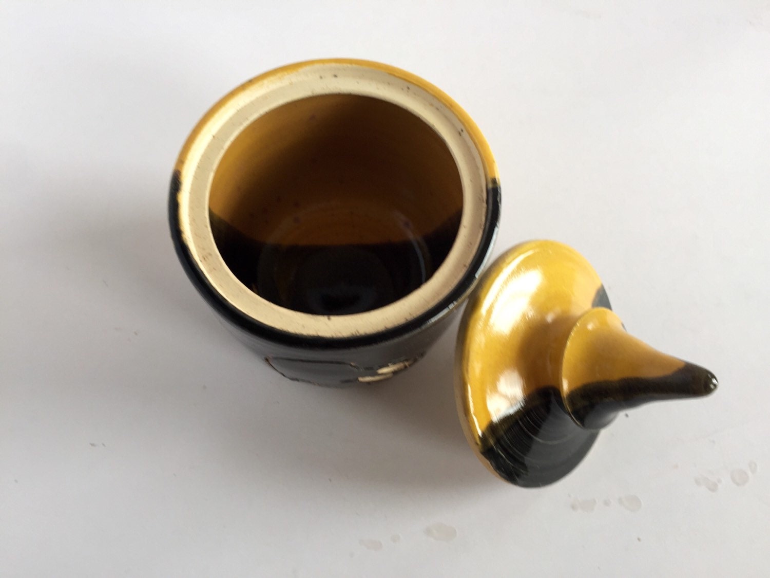 This adorable Harry Potter inspired jar was thrown in two pieces on the potters wheel. First the jar portion then the lid was thrown with a witches hat as a knob. Hand carved, then glazed in house colors this jar is great for all the Harry Potter fans out there!