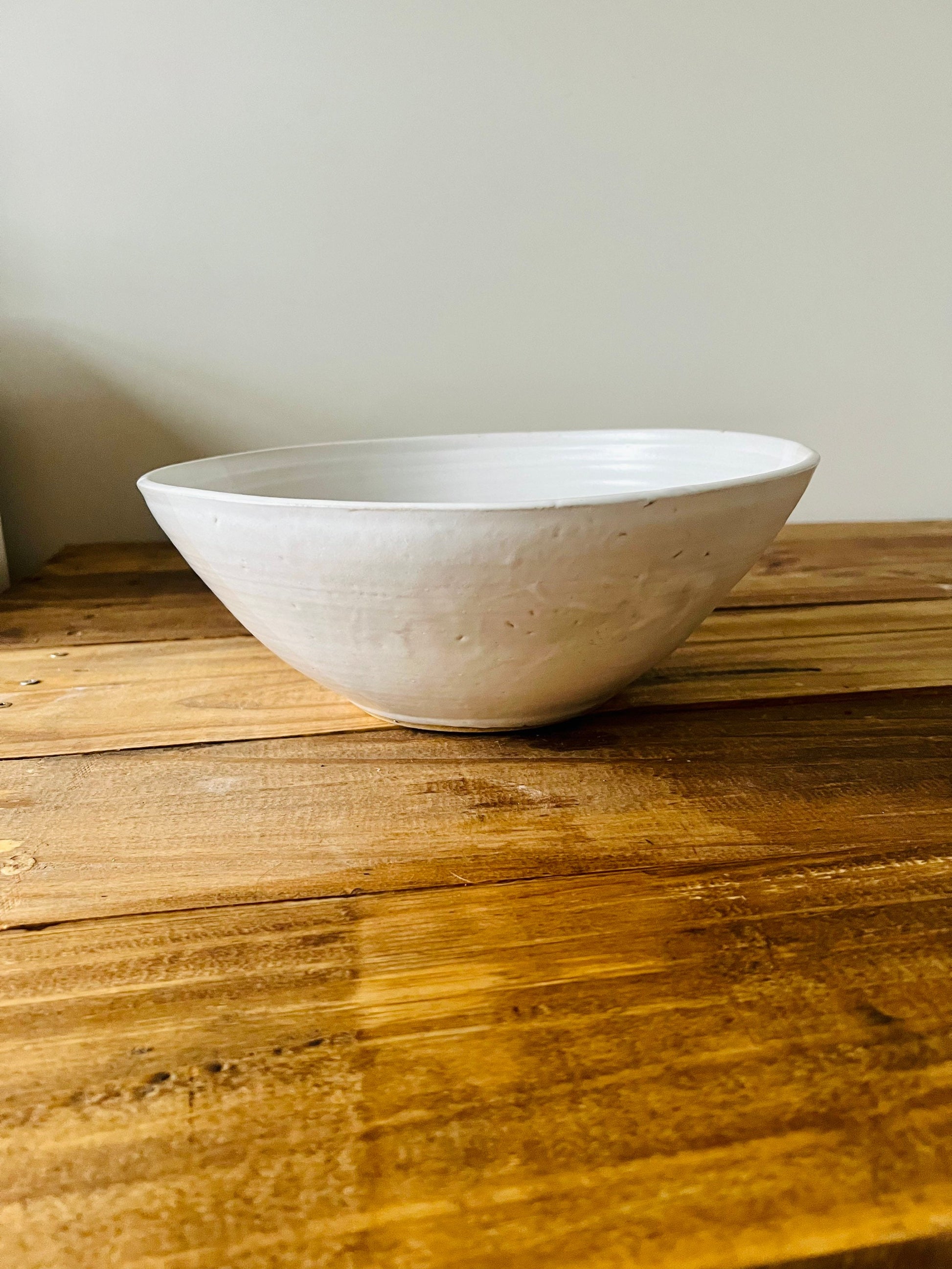 Thrown on the potters wheel and glazed on the inside in white. this large bowl is perfect for serving, fruit bowls, presentation bowls and more