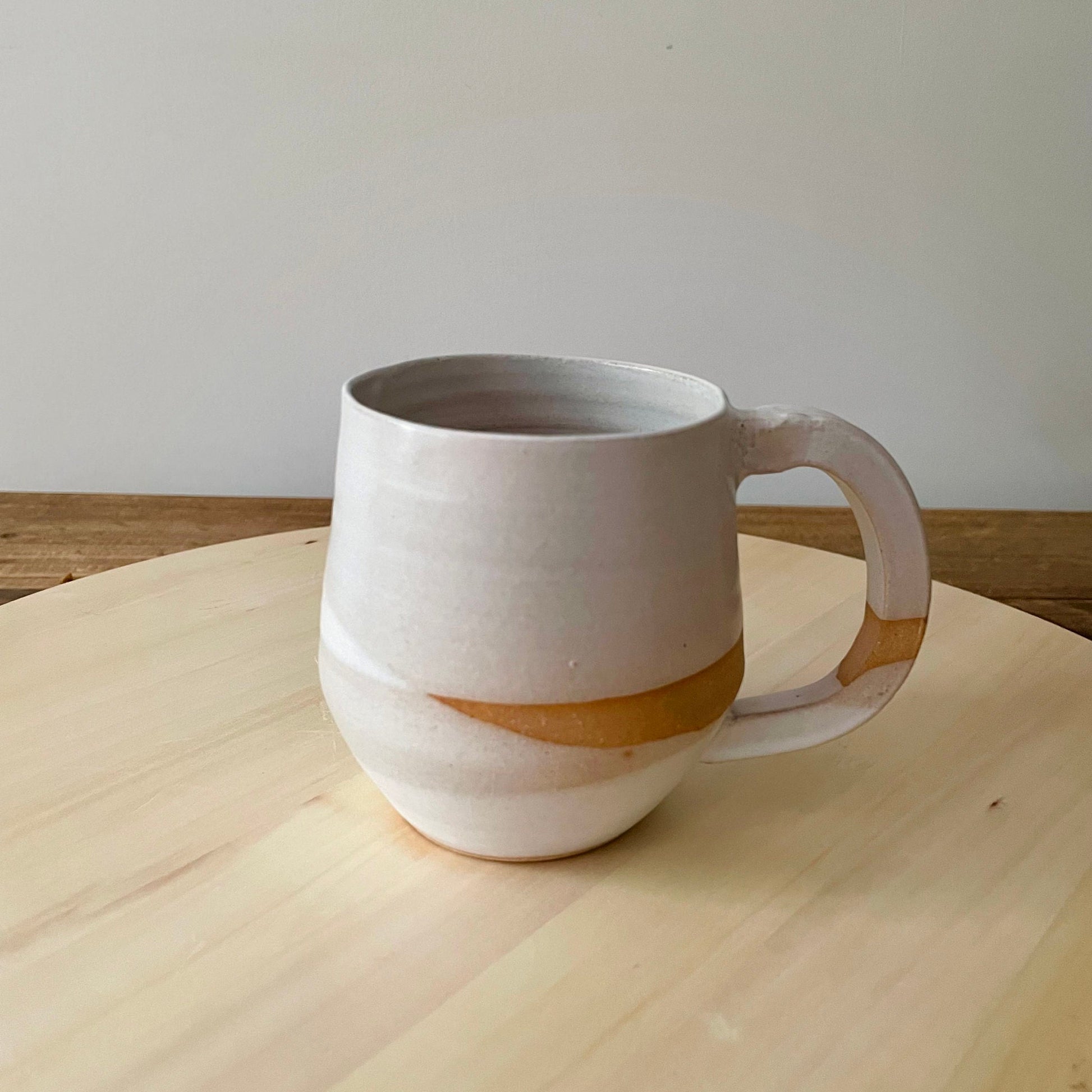 These modern coffee mugs were thrown on the potter‘s wheel using stoneware clay, affixed with a beautiful sculpted handle, then cross-dipped in a warm white glaze. Each mug is unique!