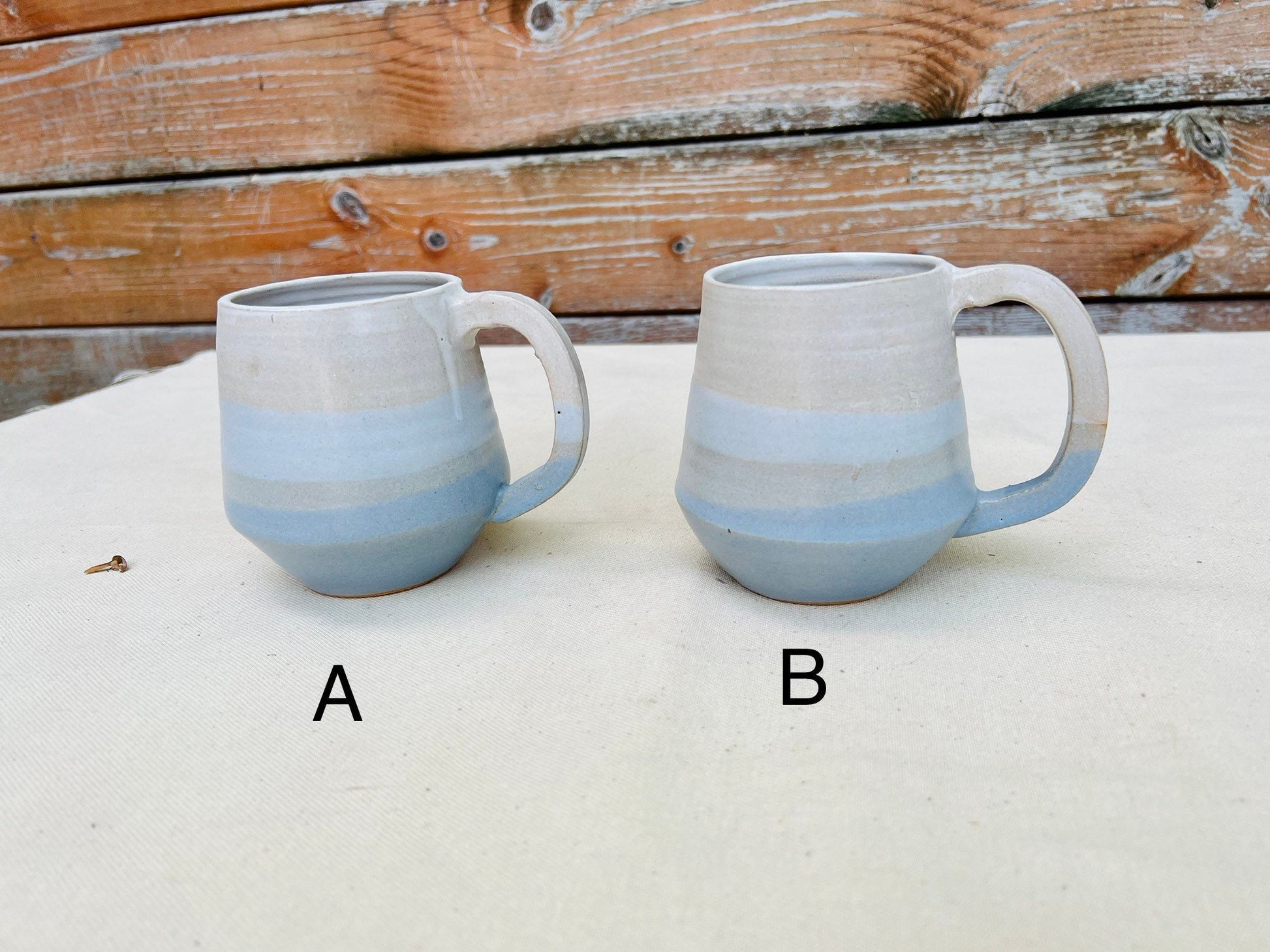 These modern coffee mugs were thrown on the potter‘s wheel using stoneware clay, and cross-dipped in warm white glaze. Each mug is unique.