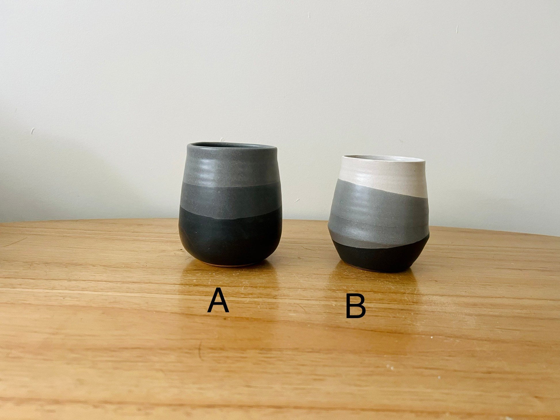 thrown on the potters wheel using stoneware, then dipped in a warm white and gray glaze.