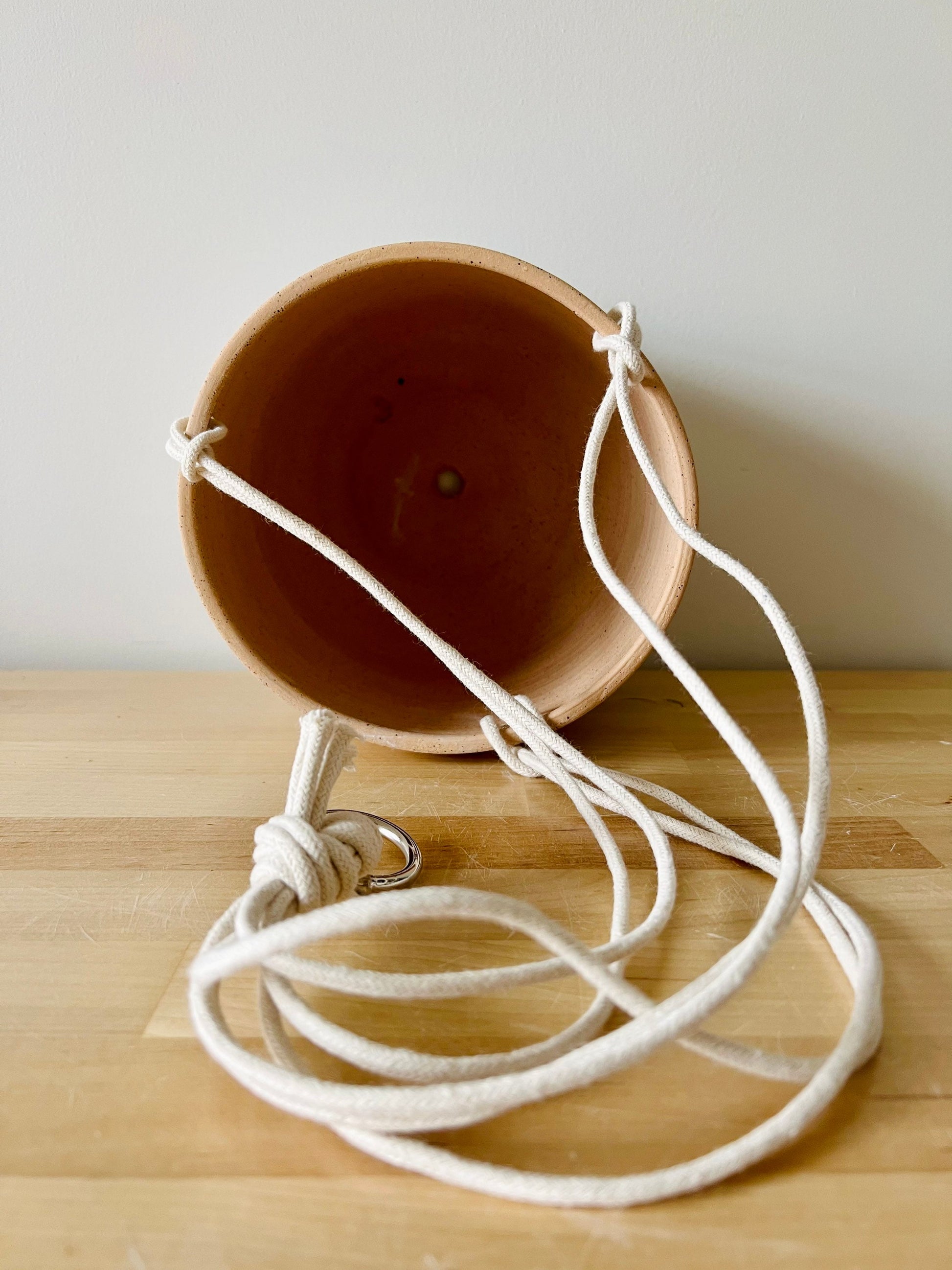 Cord with 1 inch silver 0 ring for easy hanging Included. Hole in the bottom for easy draining. Unglazed interior