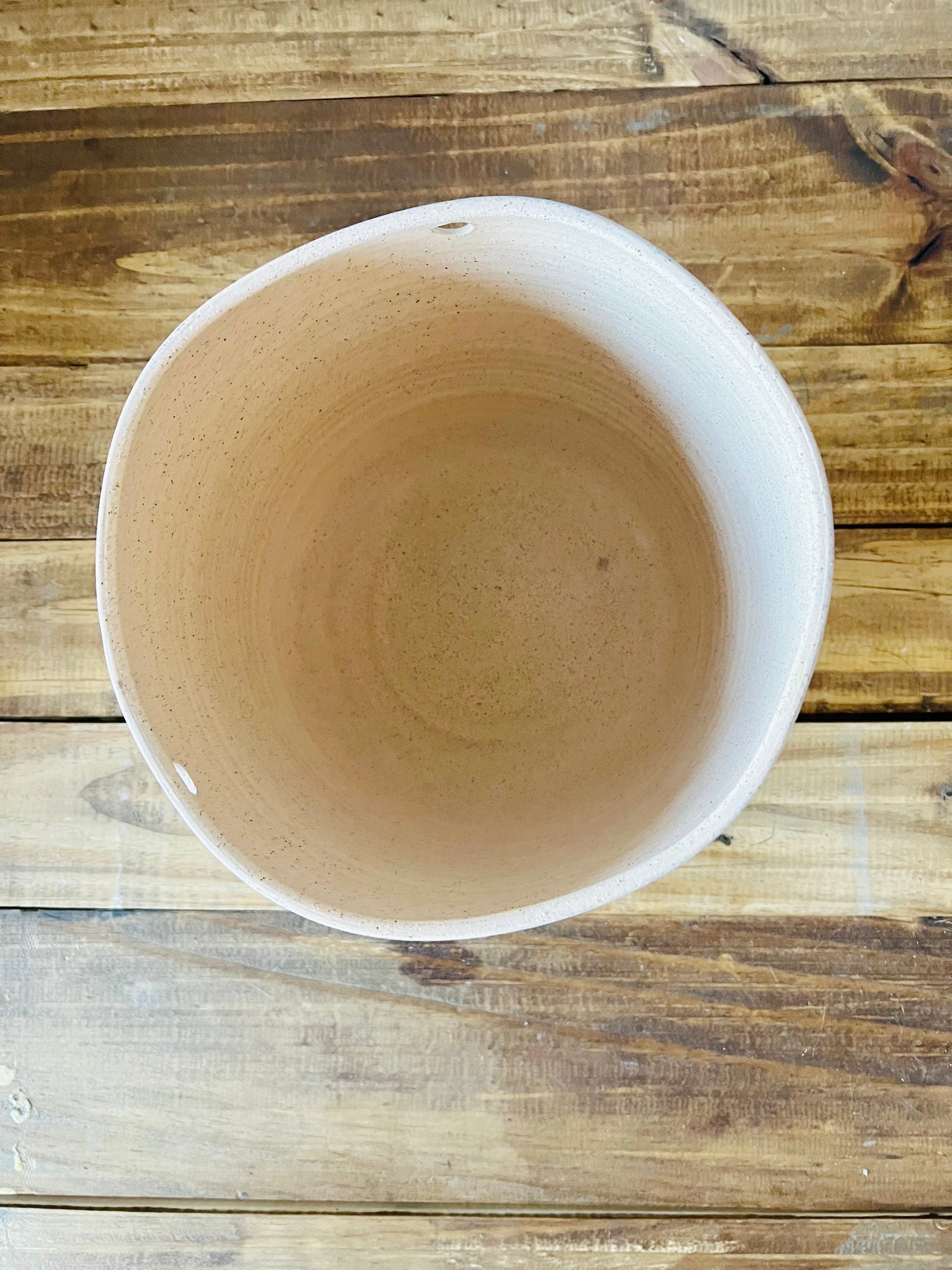 Thrown on the potters wheel then flipped over and trimmed into a round orb. Dipped in porcelain slip then glazed on the outsIde in white giving them the two tone effect.