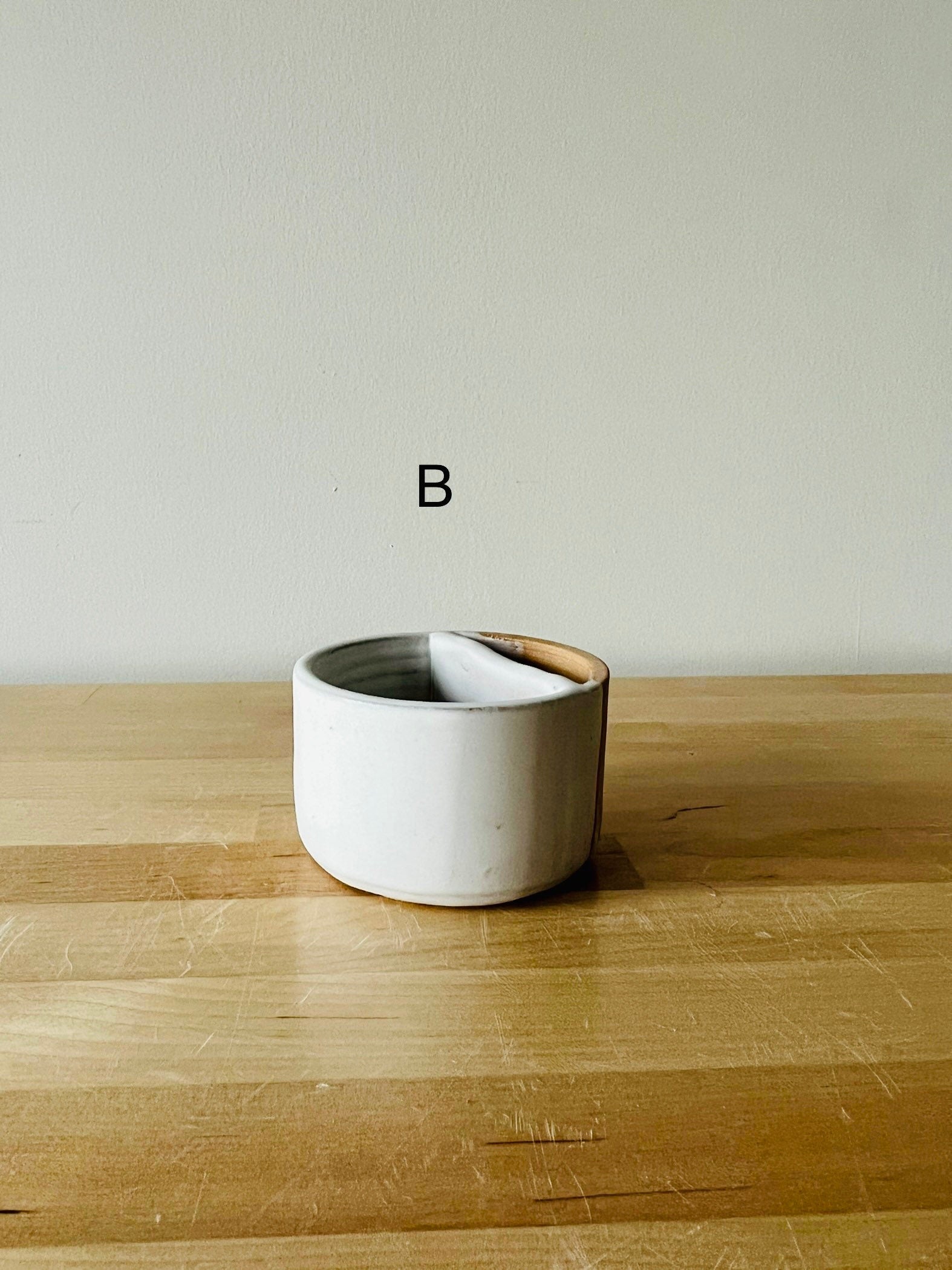 These match striker jar’s were thrown on the potters wheel. The stoneware jar was then hand cut to divide used matches and unsued matches . hand poured over with porcealn slip then glazed in white. strike anywhere on the un-glazed side of the jar and the match will light. Discard the used match in the discard slot.