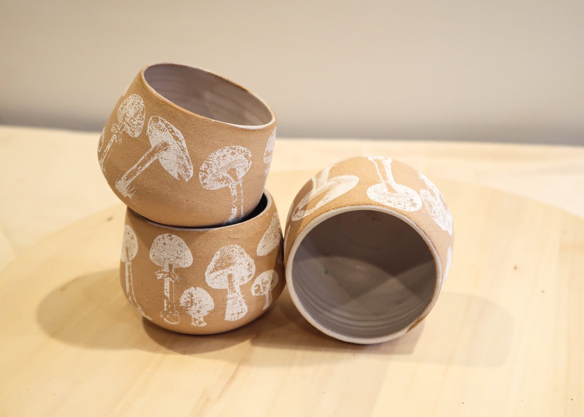 These charming ceramic cups were thrown on the potter‘s wheel using stoneware clay, glazed inside with a warm white for a smooth finish, and finished with a white mushroom decal. Each mug is unique.
