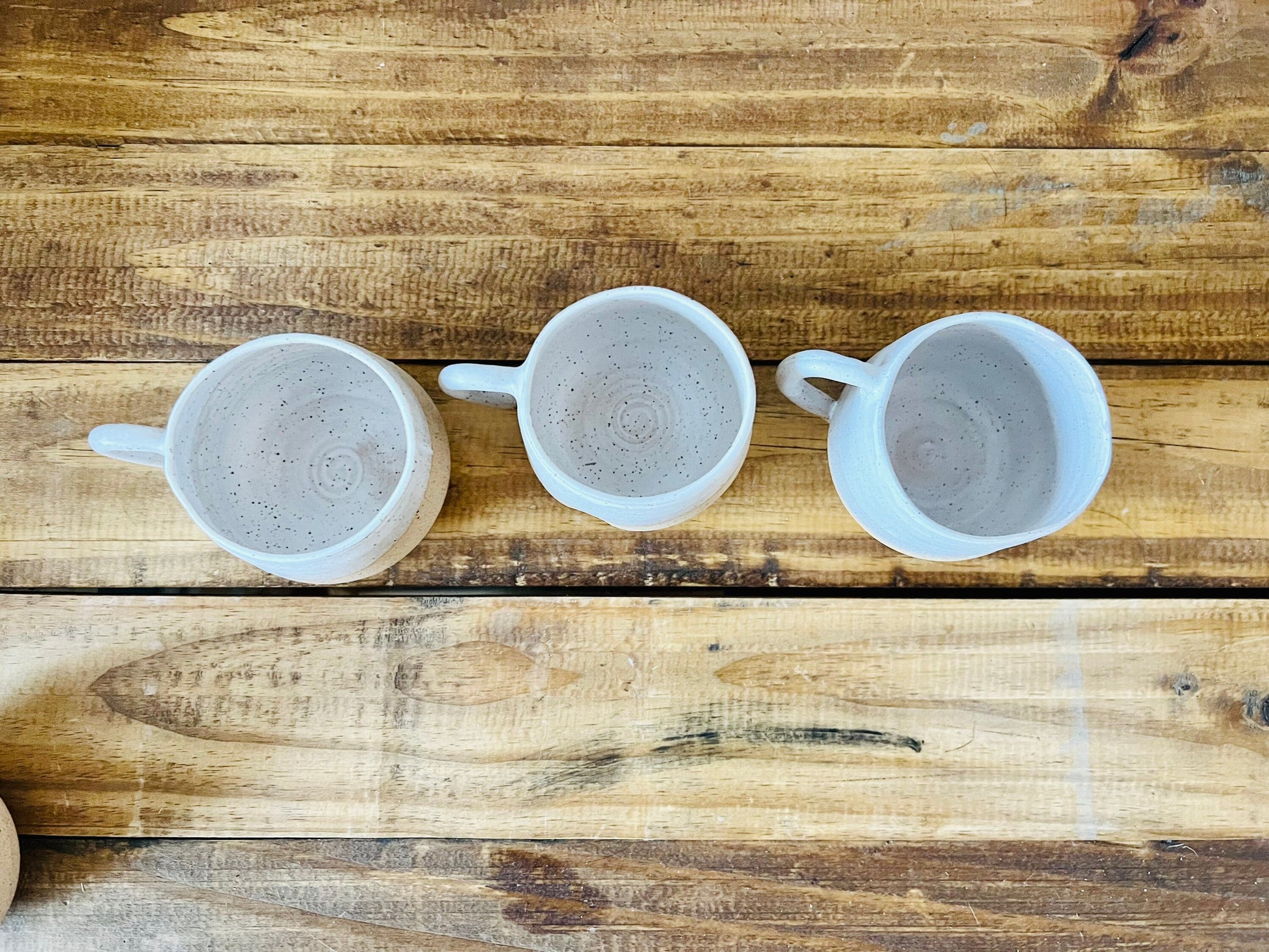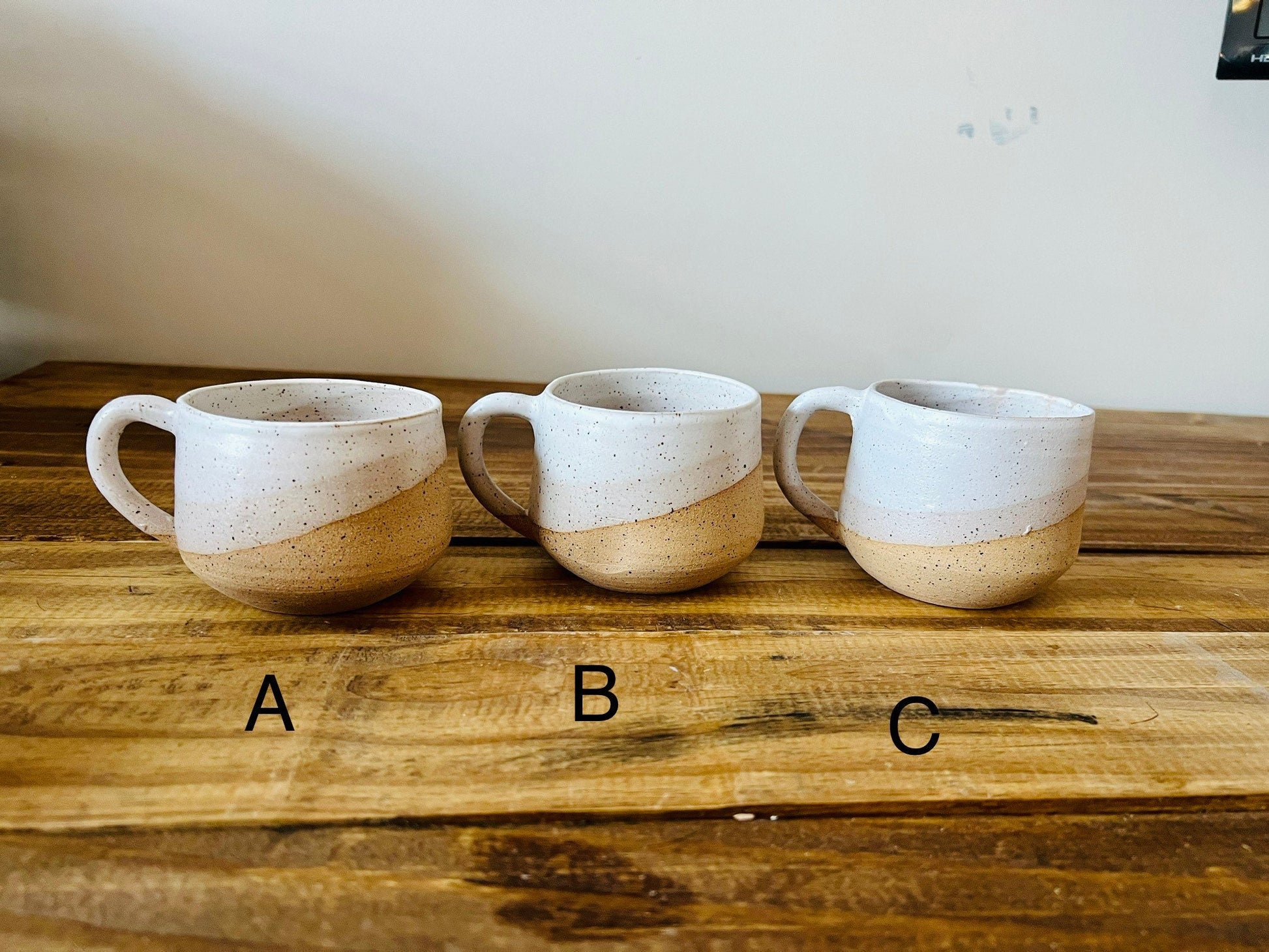These modern oversized espresso mugs were thrown on the potters wheel using a stone ware, attached with a handle then dipped in a warm white glaze. Each mug is unique.