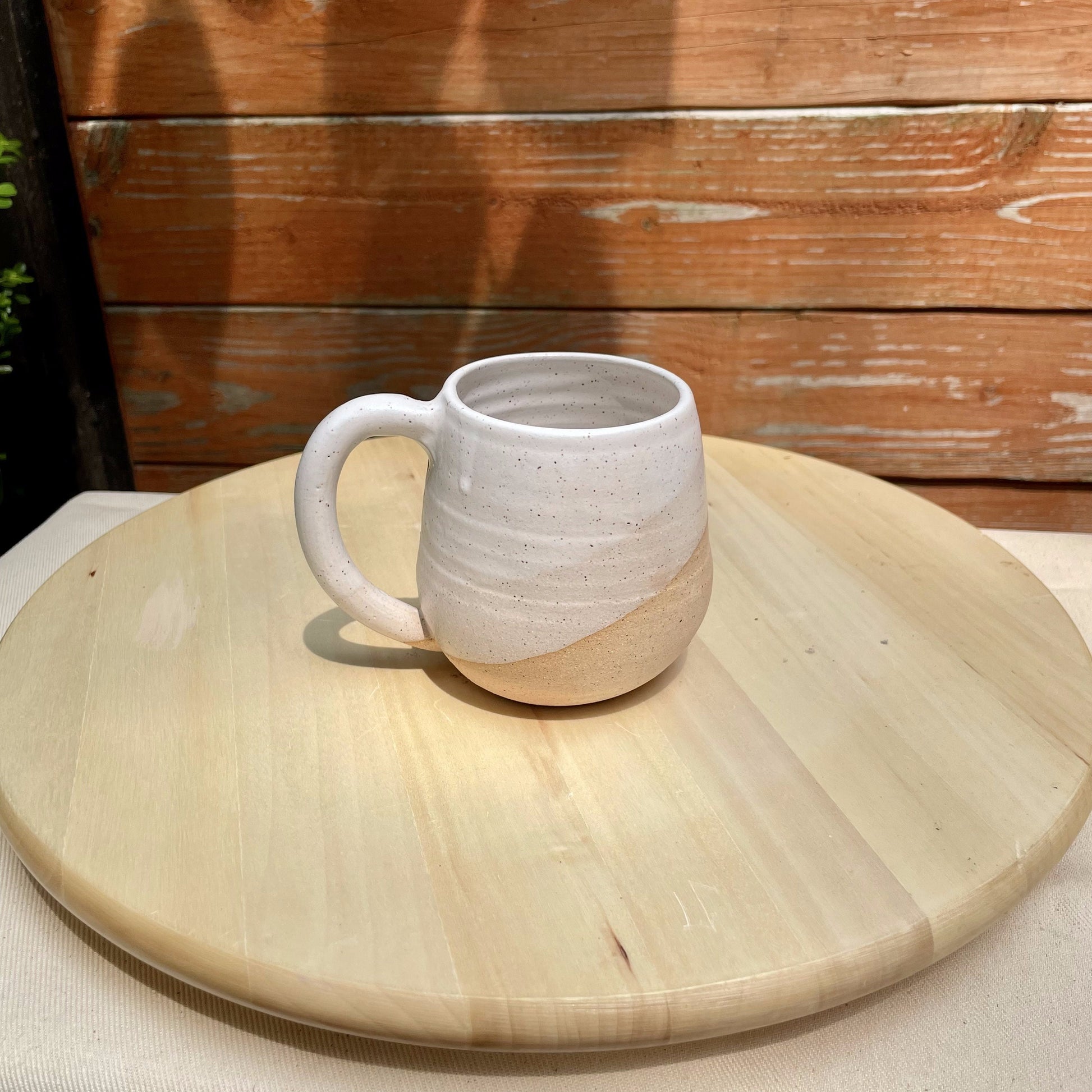This modern coffee mug was thrown on the potters wheel using a speckled stoneware, attached with a handle then dipped in a warm white glaze.