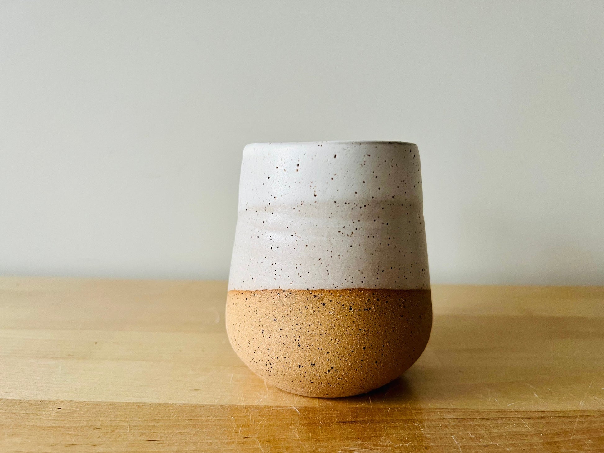 These modern coffee mugs were thrown on the potters wheel using a speckled stone ware, attached with a handle then dipped in a warm white glaze. Each mug is unique.