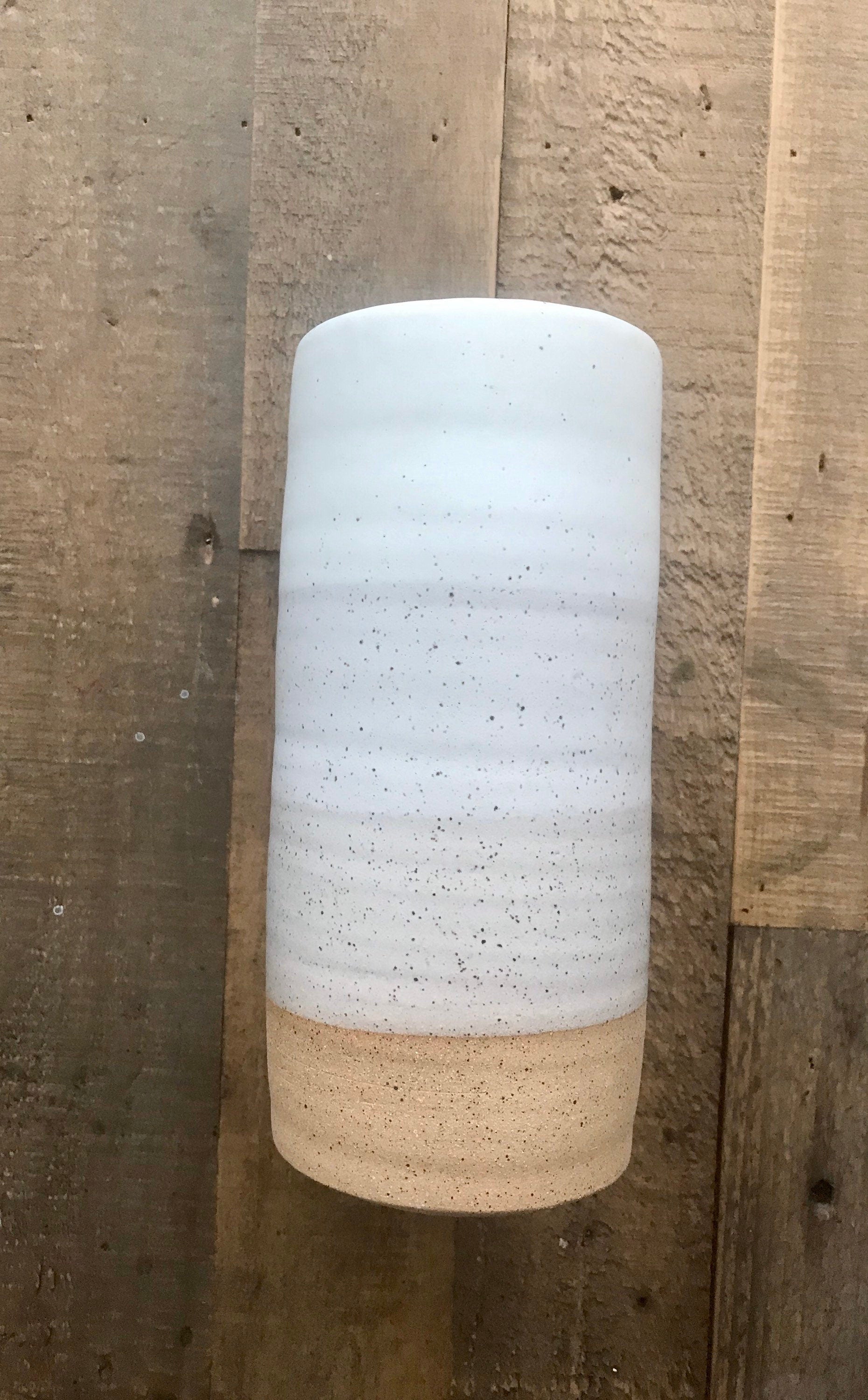Handmade on the potters wheel out of stoneware clay. Hand dipped in porcelain then glazed in a warm white. Great for use as a flower wave, kitchen utensil holder and much more!