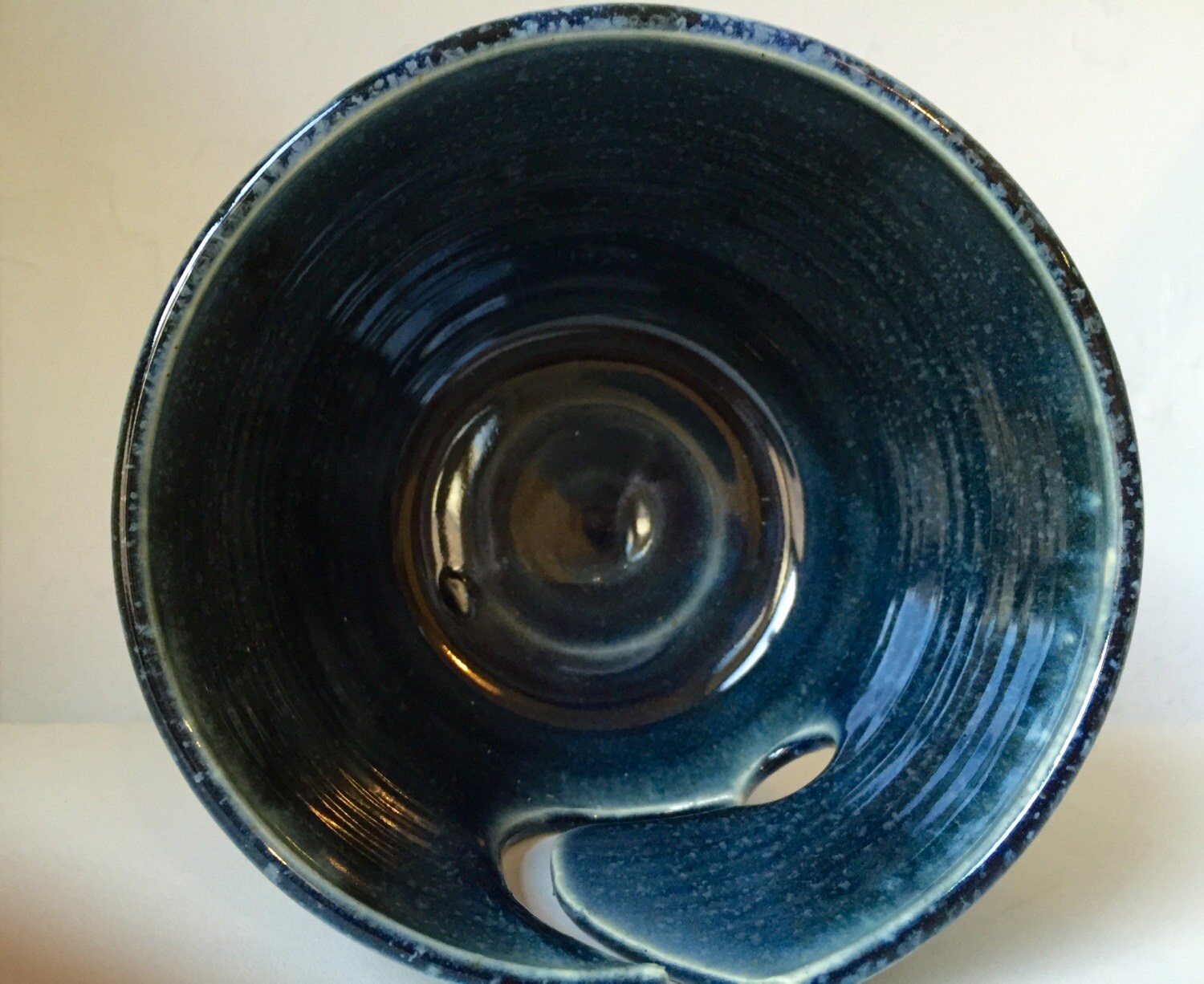 Thrown on the potters wheel, this yarn bowl was then cut out into a pattern to catch and keep a strand of yarn flowing out of the cutout. Glazed in a blue indigo this yarn-bowl is very decorative and functional and a helpful tool for all the knitting gods and goddesses out there.